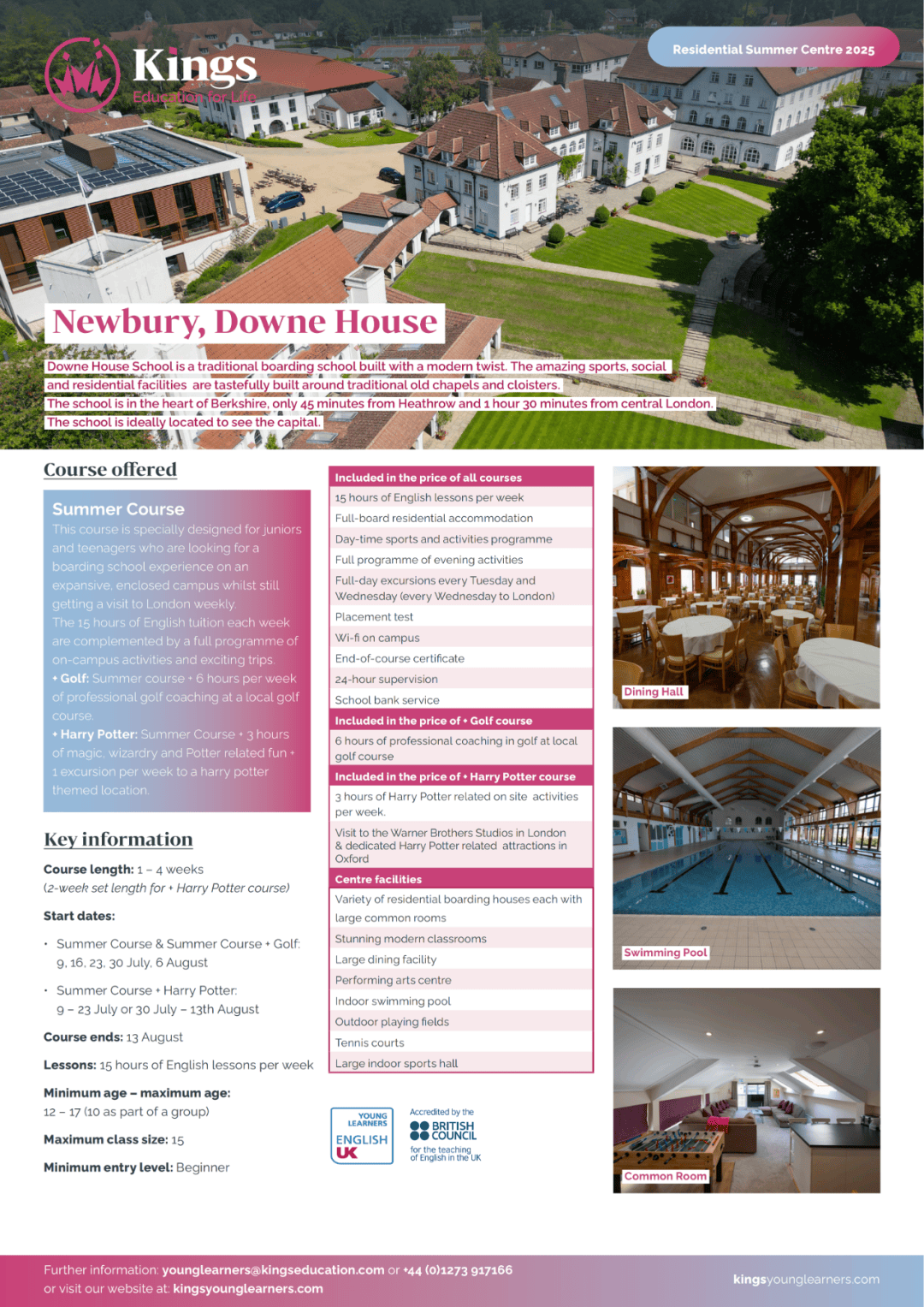 唐屋夏校由国王教育(Kings Education)主办,营地位于英国著名女校唐屋中学(Downe House School),面向10-17 岁青少年,提供 1-4 周灵活时长的沉浸式夏校体验。夏校以 “英语学习为核心,多元活动为辅助,文化探索为延伸”,让学生在唐屋的优美校园中提升英语能力、拓展兴趣爱好、感受英国文化魅力,同时享受国际化的社交氛围。