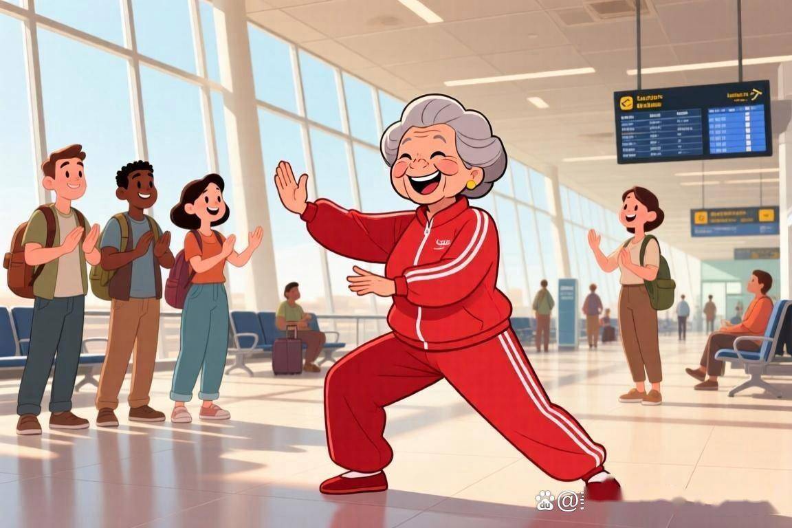 转机就在这时出现。旁边候机的外国旅客,先是远远看着,后来干脆凑了过来,有人还用手比划着,想一起学。“我们领舞的阿姨会点英语,简单教了他们几个动作,没想到他们学得特别认真。”