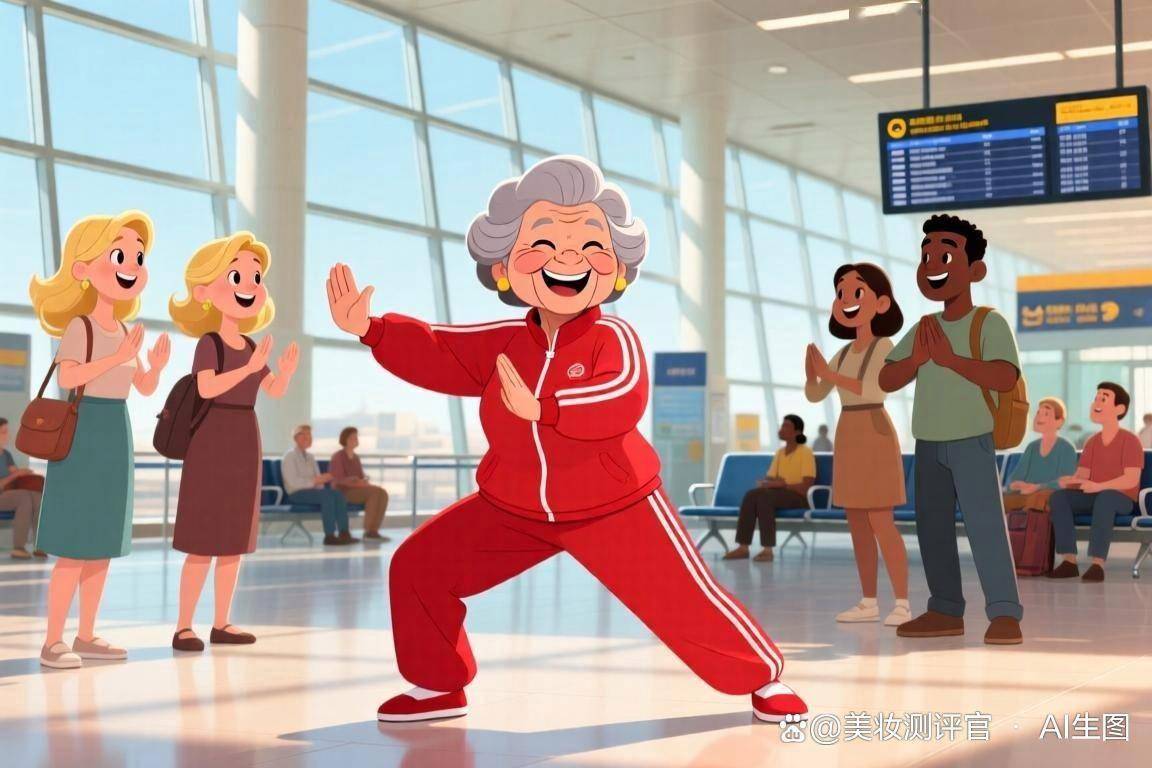 不是因为好笑,是那种突如其来的亲切感——候机大厅里,几个中国大妈站成一排,抬手、转身、伸臂,动作慢悠悠的,是咱再熟悉不过的八段锦。更妙的是,旁边几个高鼻梁、黄头发的老外,正跟着有模有样地比划,眼神里全是好奇。